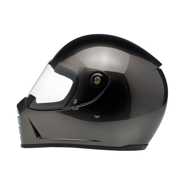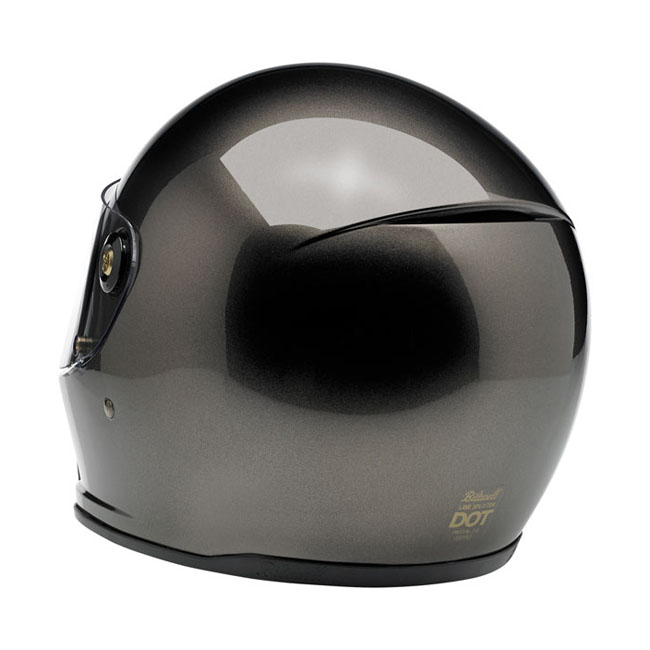 The Lane Splitter is crafted around Biltwell’s proprietary ABS outer shell and features a shock-absorbing EPS liner with hand-stitched interior padding, cheek pads and BioFoam chin bar cushion for comfort. Generous vents in the chin bar get the air flowing and the outlet in back lets hot air escape. The Lane Splitter shield boasts extremely accurate optics and simple hinge mechanics for high style and easy removal for replacement or cleaning. A brass peg and hole configuration on the left side of the shield offers speedy opening and secure closing with little fanfare or complication. Mesh pockets are included in the ear recess–perfect for aftermarket drop in communication systems.