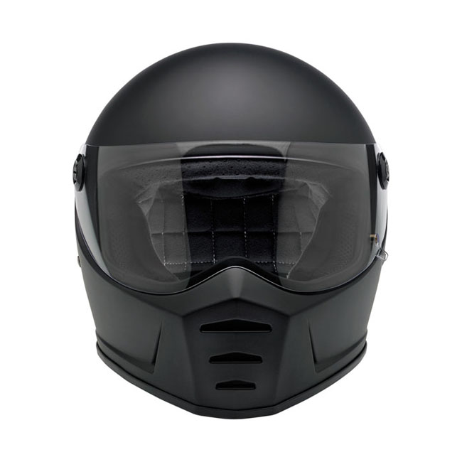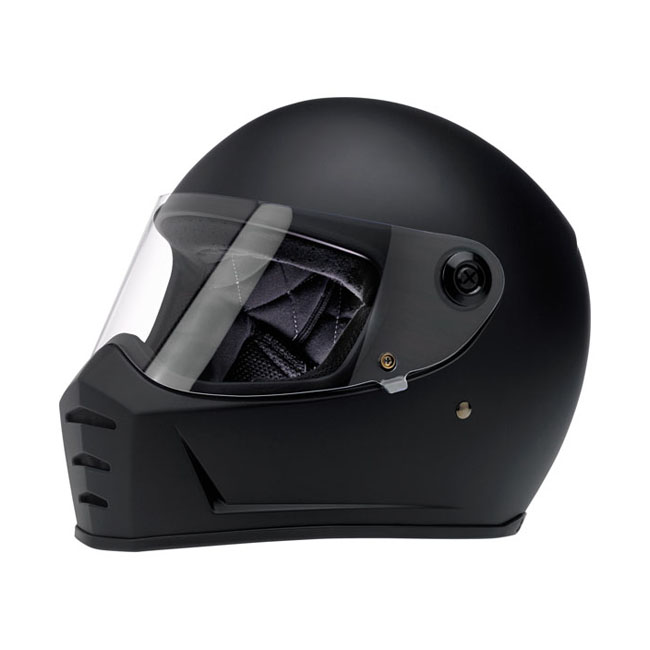 The Lane Splitter is crafted around Biltwell’s proprietary ABS outer shell and features a shock-absorbing EPS liner with hand-stitched interior padding, cheek pads and BioFoam chin bar cushion for comfort. Generous vents in the chin bar get the air flowing and the outlet in back lets hot air escape. The Lane Splitter shield boasts extremely accurate optics and simple hinge mechanics for high style and easy removal for replacement or cleaning. A brass peg and hole configuration on the left side of the shield offers speedy opening and secure closing with little fanfare or complication. Mesh pockets are included in the ear recess–perfect for aftermarket drop in communication systems.