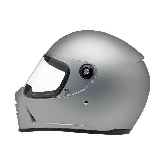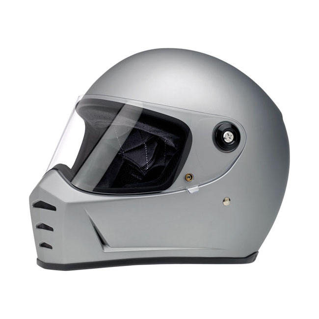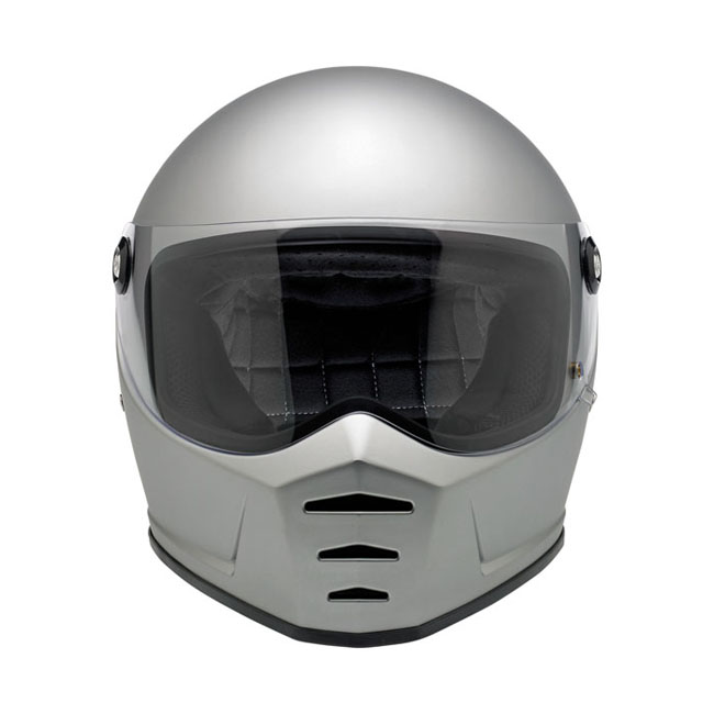 The Lane Splitter is crafted around Biltwell’s proprietary ABS outer shell and features a shock-absorbing EPS liner with hand-stitched interior padding, cheek pads and BioFoam chin bar cushion for comfort. Generous vents in the chin bar get the air flowing and the outlet in back lets hot air escape. The Lane Splitter shield boasts extremely accurate optics and simple hinge mechanics for high style and easy removal for replacement or cleaning. A brass peg and hole configuration on the left side of the shield offers speedy opening and secure closing with little fanfare or complication. Mesh pockets are included in the ear recess–perfect for aftermarket drop in communication systems.
