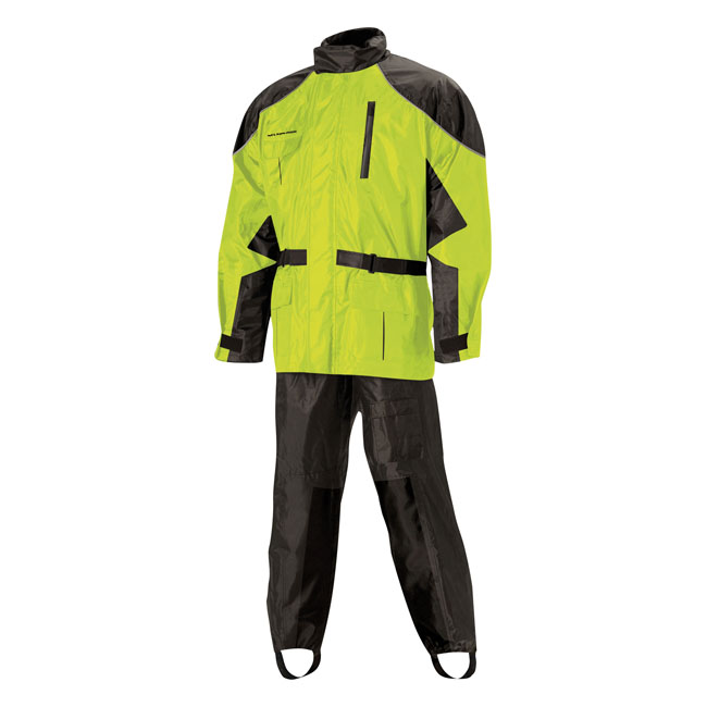 Two-piece 100% waterproof rain suit with soft Polyester outer shell with PVC backing. Jacket has full-length zipper with Velcro® storm flap. Complete breathable mesh lining, full length adjustable zipped back ventilation system and three waterproof outer pockets. Soft corduroy inner collar with hood. Adjustable cuff with Velcro® tabs. Reflective piping on both jacket and pants for night visibility. Pants with adjustable elastic suspender straps. From heat resistant material to protect legs from contact with hot parts.