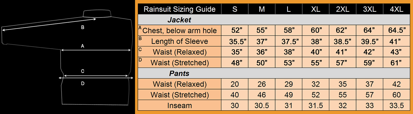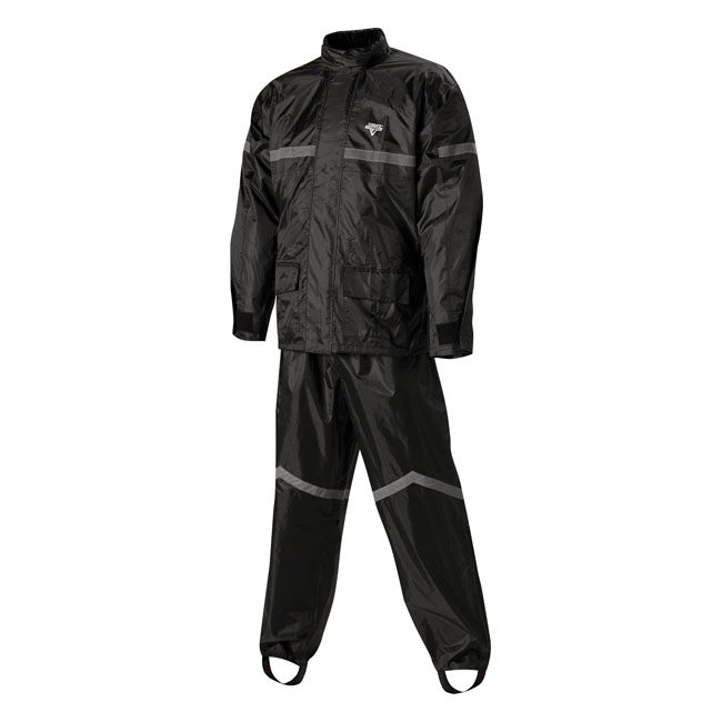 Two-piece 100% waterproof rain suit with soft Polyester outer shell with PVC backing. Jacket has full-length zipper with Velcro® storm flap. Two large outer pockets. Cooling vents under each arm. Soft corduroy inner collar with hood. Elasticized waist and adjustable cuff with Velcro® tabs. Reflective striping on both jacket and pants for night riding. Pants feature elasticized waist band,cuffs with 17” zipper gussets for easy boot entry, and elasticized boot stirrups.